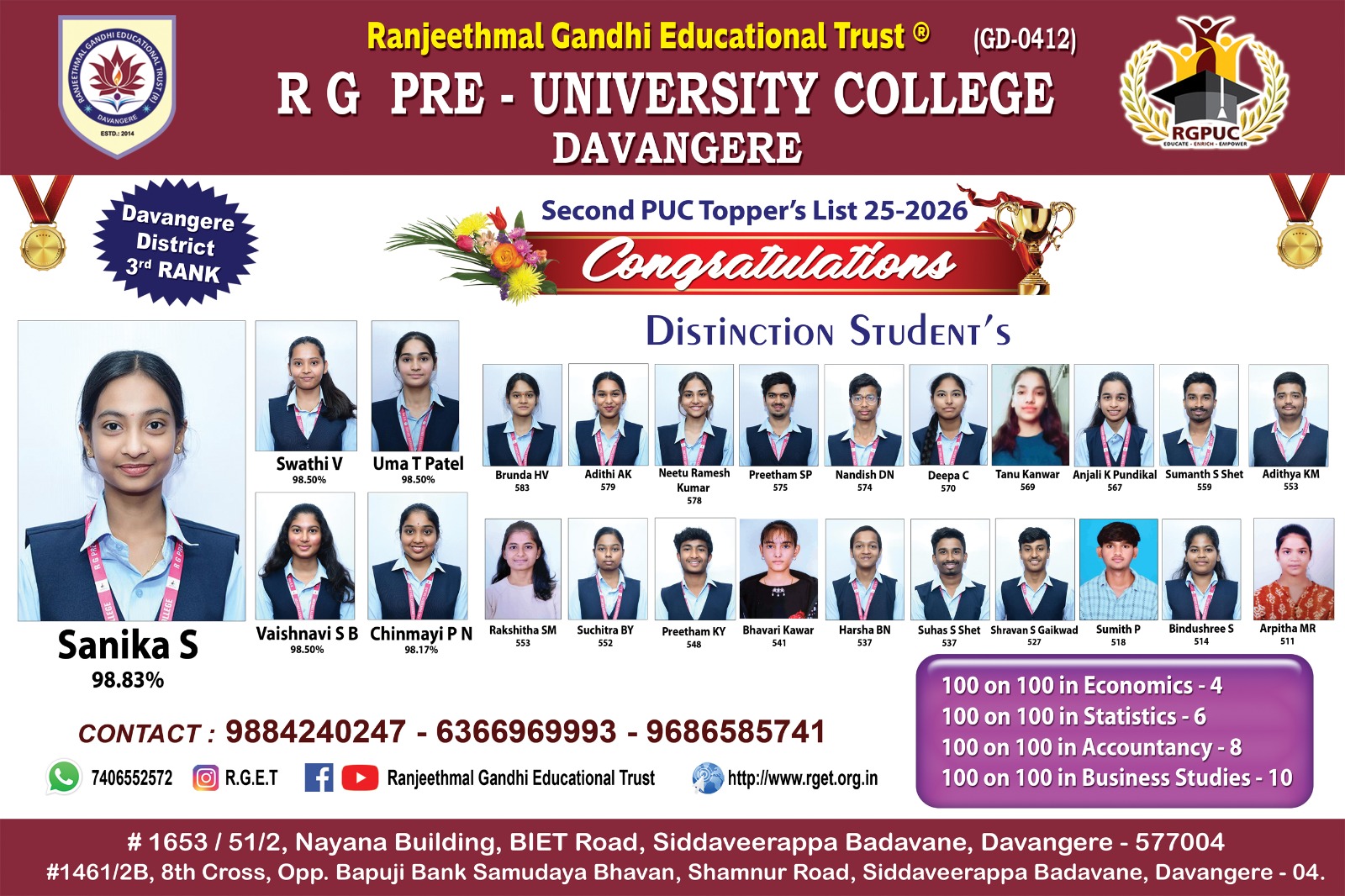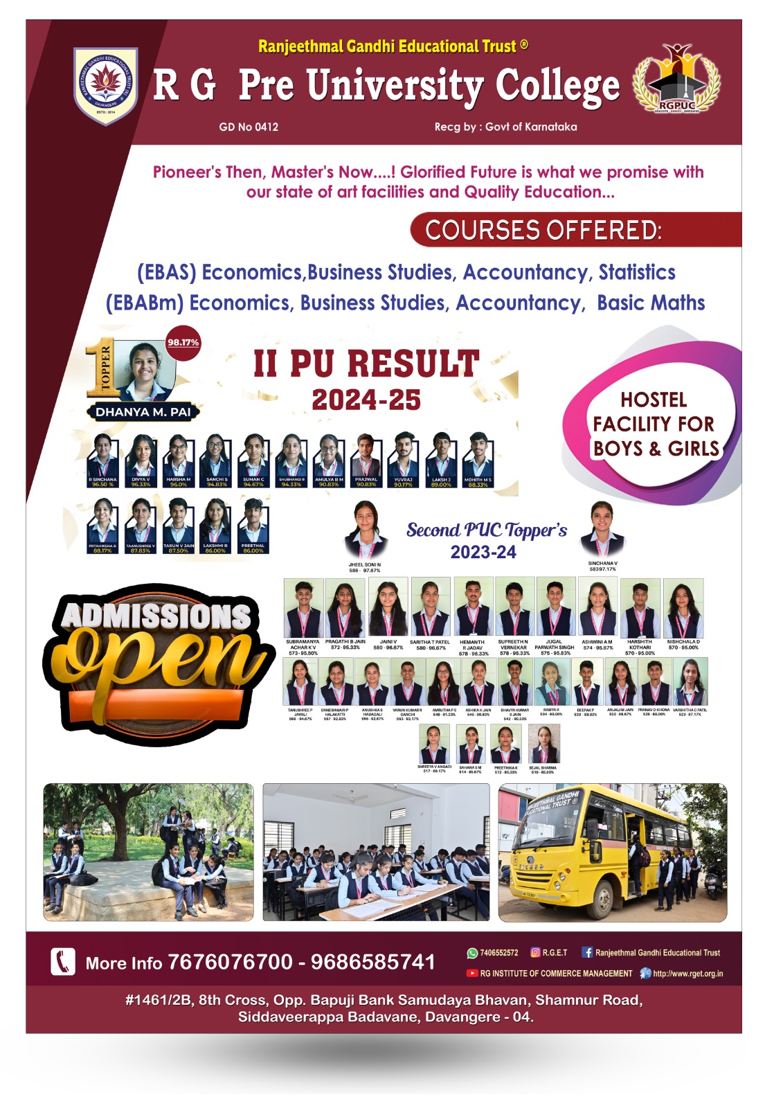 RG Pre University is a college which drives for excellence in education and discipline. our vision is to create a path of success with harmony and hard work. To achieve this mile stone we have a dedicated team as our backbone which is deliberately aiming at enhancing student's Academic and co curricular activities with Holistic approach and to empower youth to be at the forth front of future challenges.